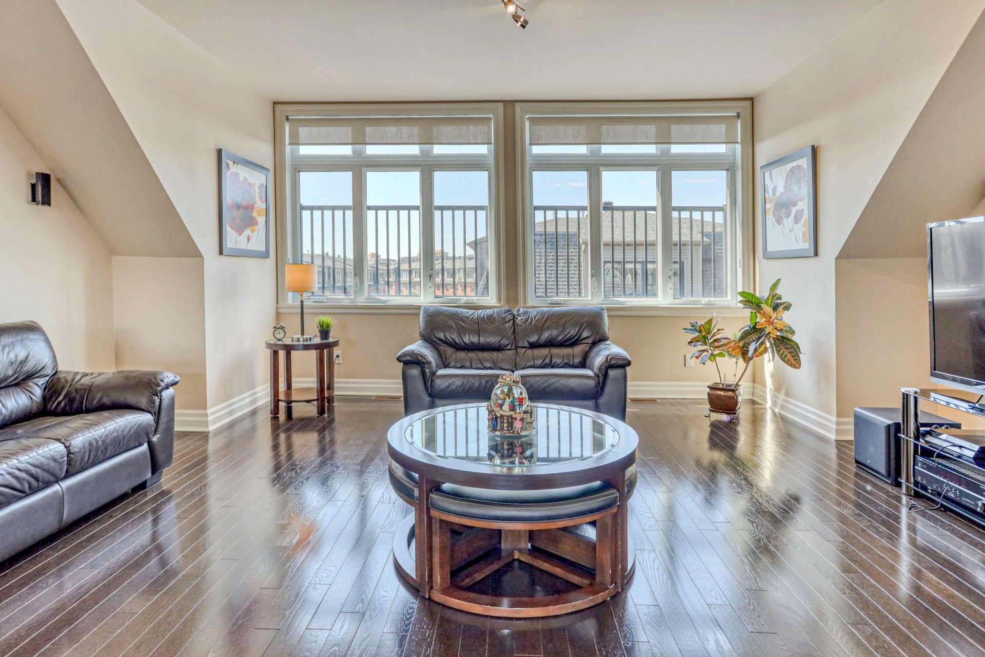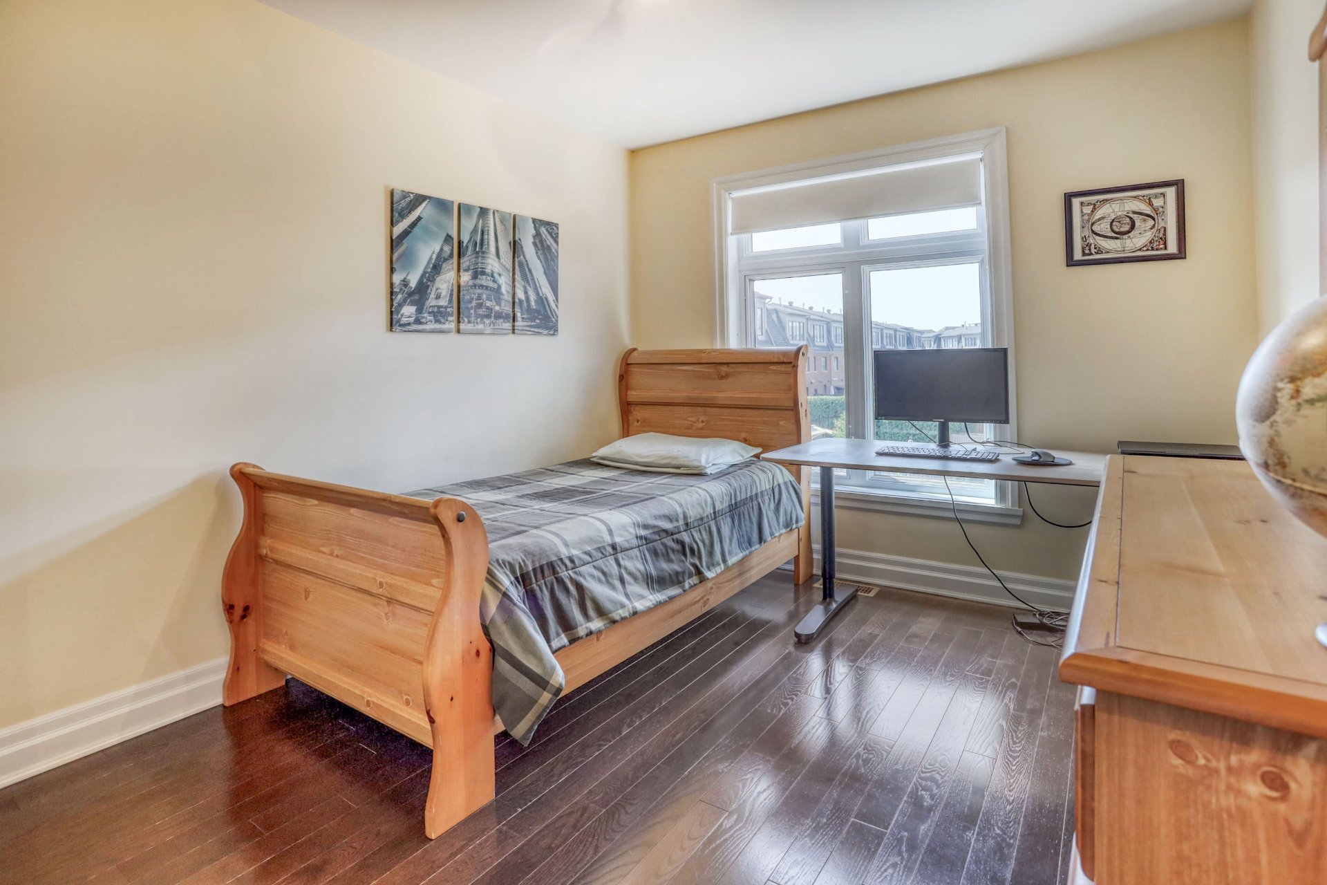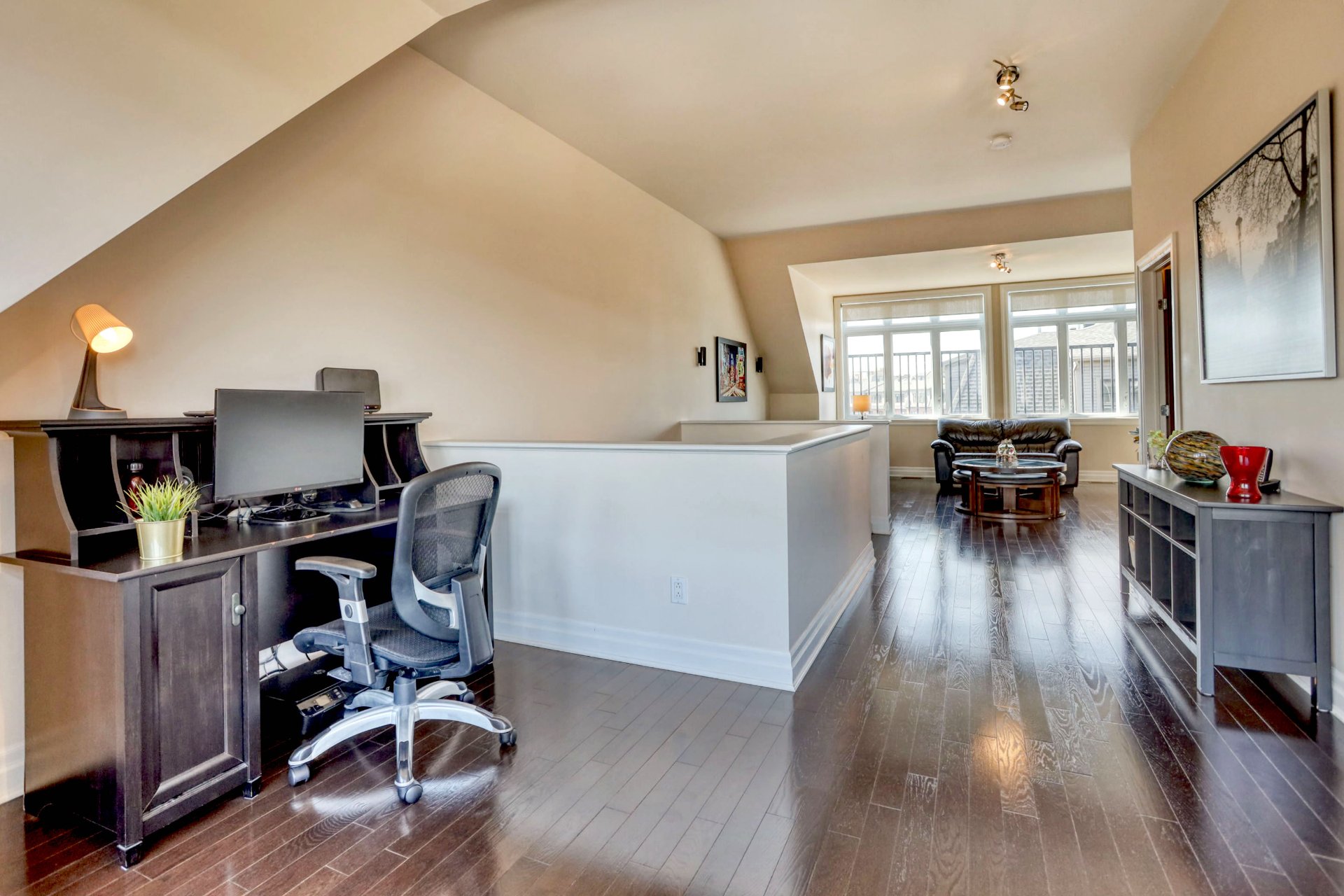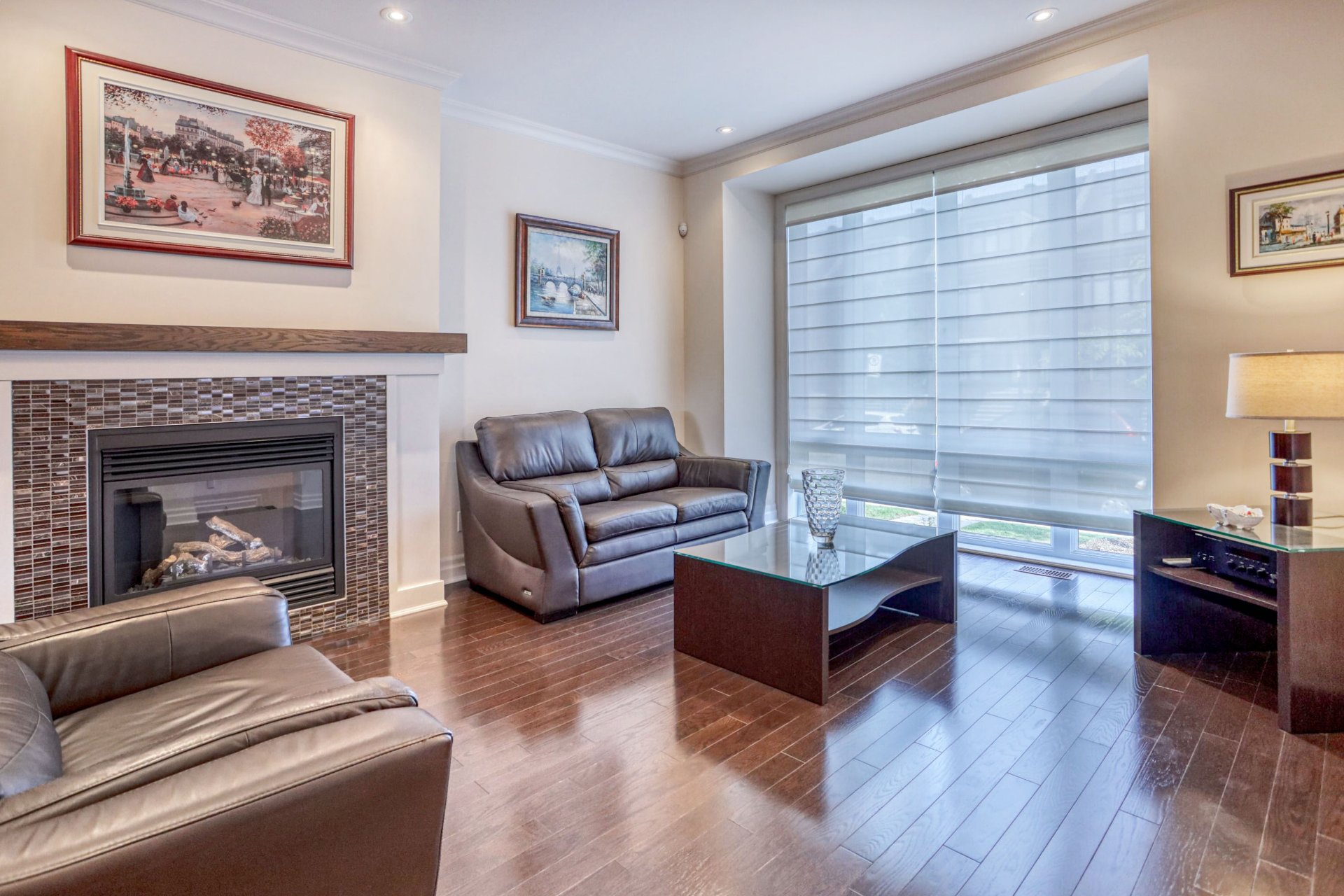 Immaculate townhouse by Sotramont - Les Villas Des Migrations - in fantastic condition. Steps to the park and located on a quiet street, this home offers a beautiful closed kitchen with granite counters, gorgeous wood floors throughout and plenty of light. Features three good size rooms, two full bathrooms with the possibility to have the master suite in the mezzanine. Gas fireplace and heating, dual zone thermostat control, private double garage and yard with large deck. Just move right in!